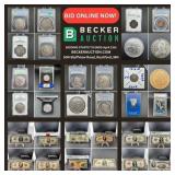 1 Starts Closing Monday, April 13th @ 7 P.m. Starts Closing Monday, April 13th @ 7 P.m. 1 Inspection Dates: By Appointment Only! Auction Lo Inspection Dates: By Appointment Only! Auction Location: 504 Bluffview Road, Rushford, MN 55971 You are encouraged to join our inspection days. NO REFUNDS OR RETURNS on items. It's the buyer's responsibility to check item(s) for completeness, condi 1 Pick-up: Tuesday, April 14th: 9 A.m. -5 P.m. Only! Pick-Up: Tuesday, April 14th: 9 a.m. -5 p.m. Only! Auction Location: 504 Bluffview Road, Rushford, MN 55971 1 Payment: Cash, Credit/debit Card Or Good Check (wi Payment: Cash, Credit/Debit Card or Good Check (with a positive I.D.) payable to Becker Auction paid on pick up day before removing merchandise. Premium: 15% Buyer Fee added to your items unless otherwise stated. 5% discount on cash and check purchas 1 Shipping Available! Fees Apply; Heavy & Bulky Item Shipping Available! Fees Apply; Heavy & Bulky Items Can Get Expensive! Please keep this in mind while bidding! Local Pick-Up Preferred 1 Auction Location: 504 Bluffview Road, Rushford, Mn Auction Location: 504 Bluffview Road, Rushford, Mn 55971 1 Please Watch Your Quantities - Make Sure You Know PLEASE watch your quantities - make sure you know if it is TIMES the money or if you are bidding on ONE lot 1 Login Issues- Call 844.775.4774 Login Issues- Call 844.775.4774 1 1878-cc Gsa Morgan Silver Dollar With Box & Papers 1878-CC GSA Morgan Silver Dollar with box and papers. 2 1884-cc Gsa Morgan Silver Dollar With Box & Papers 1884-CC GSA Morgan Silver Dollar with box and papers. 3 1884-cc Gsa Morgan Silver Dollar With Box & Papers 1884-CC GSA Morgan Silver Dollar with box and papers. 4 1883-cc Gsa Morgan Silver Dollar With Box & Papers 1883-CC GSA Morgan Silver Dollar with box and papers. 5 1884-cc Gsa Morgan Silver Dollar With Box & Papers 1884-CC GSA Morgan Silver Dollar with box and papers. 6 Rare 1885-cc Gsa Hoard Morgan Silver Dollar Ms62 1885-CC GSA Hoard Morgan Silver Dollar graded MS62. 7 1883-cc Gsa Hoard Morgan Silver Dollar Ms63 1883-CC GSA Hoard Morgan Silver Dollar graded MS63. 8 1884-cc Gsa Hoard Morgan Silver Dollar Ms63 1884-CC GSA Hoard Morgan Silver Dollar graded MS63. 9 1884-cc Gsa Morgan Silver Dollar 1884-CC GSA Morgan Silver Dollar. 10 1884-cc Gsa Morgan Silver Dollar 1884-CC GSA Morgan Silver Dollar. 11 1884-cc Gsa Morgan Silver Dollar In Box 1884-CC GSA Morgan Silver Dollar in box. 12 1883-cc Gsa Morgan Silver Dollar 1883-CC GSA Morgan Silver Dollar. 13 Rare 1879-o Gsa Morgan Silver Dollar Soft Pack 1879-o Gsa Morgan Silver Dollar In Original Soft Pack (blue Envelope Holder). 14 1878-cc Morgan Silver Dollar Pcgs Ms61 1878-CC Morgan Silver Dollar graded PCGS MS61. 15 1882-cc Morgan Silver Dollar Pcgs Ms63 1882-CC Morgan Silver Dollar graded PCGS MS63. 16 1884-cc Morgan Silver Dollar Pcgs Ms62 1884-CC Morgan Silver Dollar graded PCGS MS62. 17 1882-cc Morgan Silver Dollar Cac Unc Details 1882-CC Morgan Silver Dollar graded CAC UNC Details; Wiped, Obverse. 18 1884-cc Morgan Silver Dollar Anacs Ms63 1884-CC Morgan Silver Dollar graded ANACS MS63. 19 Key Date Rare1889-cc Morgan Silver Dollar Ngc Vf20 1889-cc Morgan Silver Dollar Graded Ngc Vf20. 20 1885-cc Morgan Silver Dollar Pcgs Ms66 1885-CC Morgan Silver Dollar graded PCGS MS66. 21 1891-cc Morgan Silver Dollar - Higher Grade 1891-CC Morgan Silver Dollar; higher grade example in protective holder. 22 1922 Peace Silver Dollar Binion Ms65 Prestige Set 1922 Peace Silver Dollar from Binion Silver Hoard; #21 of 970; MS65 Prestige Set. 23 1926 Peace Silver Dollar Pcgs Ms63 1926 Peace Silver Dollar graded PCGS MS63. 24 1922-d Peace Silver Dollar Ngc Ms63 1922-D Peace Silver Dollar graded NGC MS63. 25 1935 Peace Silver Dollar Ngc Ms65 1935 Peace Silver Dollar graded NGC MS65. 26 1922-d Peace Silver Dollar Ngc Ms64 1922-D Peace Silver Dollar graded NGC MS64. 27 1921-d Morgan Silver Dollar Pcgs Ms63 1921-D Morgan Silver Dollar graded PCGS MS63. 28 1921-s Morgan Silver Dollar Pcgs Ms64 1921-S Morgan Silver Dollar graded PCGS MS64. 29 1889-s Morgan Silver Dollar Ngc Ms63 1889-S Morgan Silver Dollar graded NGC MS63. 30 1890-o Morgan Silver Dollar Pcgs Ms63 1890-O Morgan Silver Dollar graded PCGS MS63. 31 1878 8tf Morgan Silver Dollar Ngc Ms63 1878 8 Tail Feathers Morgan Silver Dollar graded NGC MS63. 32 1904-s Morgan Silver Dollar Pcgs Xf40 Cac 1904-S Morgan Silver Dollar graded PCGS XF40 with CAC sticker. 33 1883-s Morgan Silver Dollar Ngc Au53 1883-S Morgan Silver Dollar graded NGC AU53. 34 1880/79-s Morgan Silver Dollar Pcgs Ms63 1880/79-S Overdate Morgan Silver Dollar graded PCGS MS63. 35 1921-s Morgan Silver Dollar Pcgs Ms64 1921-S Morgan Silver Dollar graded PCGS MS64. 36 1890-s Morgan Silver Dollar Pcgs Ms63 1890-S Morgan Silver Dollar graded PCGS MS63. 37 1921-d Morgan Silver Dollar Pcgs Ms64 1921-D Morgan Silver Dollar graded PCGS MS64. 38 1879-s Morgan Silver Dollar Reverse Of 1878 Pcgs M 1879-S Morgan Silver Dollar Reverse of 1878 variety graded PCGS MS61 with CAC sticker. 39 1884-o Morgan Silver Dollar Pcgs Ms65 1884-O Morgan Silver Dollar graded PCGS MS65. 40 1903-s Morgan Silver Dollar Ngc F15 1903-S Morgan Silver Dollar graded NGC F15. 41 1903 Morgan Silver Dollar Ngc Ms64 1903 Morgan Silver Dollar graded NGC MS64. 42 2024 Peace Silver Dollar In Box 2024 Peace Silver Dollar in presentation box. 43 2025 Morgan Silver Dollar In Box 2025 Morgan Silver Dollar in presentation box. 44 1959 U.s. Silver Proof Set - Capital Holder 1959 U.S. Proof Set in hard plastic holder. 45 1959 U.s. Silver Proof Set - Capital Holder 1959 Proof Set in hard plastic holder. 46 1960 U.s. Silver Proof Set - Capital Holder 1960 U.S. Proof Set in hard plastic holder. 47 1959 U.s. Silver Proof Set - Capital Holder 1959 United States Proof Set in hard plastic holder. 48 1959 U.s. Silver Proof Set - Capital Holder 1959 Proof Set in hard plastic holder. 49 2025 Lincoln Cent Icg Ms67 Rd Last Year Of Issue 2025 Lincoln Cent graded ICG MS67 RD; Last Year of Issue 