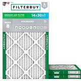 - The Filterbuy 14x30x1 Air Filter MERV 8 Essential Dust & Allergy Defense (4-Pack) is designed to improve indoor air quality in residential HVAC systems, including furnaces and air conditioners. These electrostatic pleated filters trap dust, pollen, pet dander, and other airborne particles, helping to reduce allergens and maintain a cleaner home environment. Each filter measures 13.88 x 29.88 x 0.75 inches (actual size) and fits standard 14x30x1 filter slots, making it a straightforward replacement for most HVAC systems.