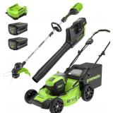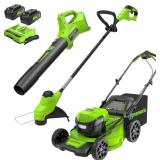 (12) Greenworks 80V 21” Brushless (Push) Cordless Electric Lawn Mower + (500 CFM) Axial Leaf Blower + 13” String Trimmer (75+ Compatible Tools), (2) 2.0Ah Batteries and 30 Minute Rapid Charger